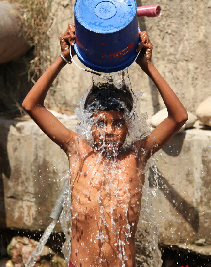 当地时间2015年5月24日,印度查谟,男孩将水浇在脸上。 图片来源:Channi Anand/东方IC