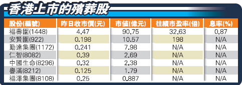 殯葬其實包含了兩個行業殯儀及墓園,近年先後有幾家從事殯葬公司以IPO(新股)或借殼形式在香港主板及創業板上市,這些殯葬股主要在內地從事殯葬行業,包括安賢園(922)、勤達集團(1172)、福壽園(1448)、仁智(8082)、福澤集團(8108)、譽滿(8212)、中國生命(8296)。透過招股文件,若干程度窺探到這個行業的特點,不過,暫時未有香港本土的殯葬企業選擇上市。