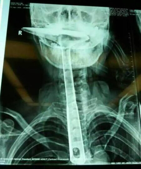 炒菜用的鍋鏟長達30公分,活生生插進自己的食道。