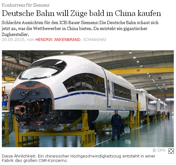 比如今天在午饭时间浏览新闻,在瑞典的科技网站Nyteknik(翻译过来叫“新技术”)上看到中国高铁出口德国的消息:Kinesiska tg rullar snart i Europa(中国列车即将在欧洲行驶)。据报道该信息源是来自Frankfurter Allgemeine Zeitung(法兰克福汇报)。顺藤摸瓜,我找到了德国的原始报道:Konkurrenz fr Siemens Deutsche Bahn will Zge bald in China kaufen(与西门子的竞争,德铁将从中国购买列车)。文章一开篇就说这对于西门子而言前景十分不妙,显然法兰克福汇报对于本国企业面对中国高铁的竞争丢了本国国有铁路公司的订单是有些情绪的。这次德铁(Deutsche Bahn)从中国进口的包括机车和配件。新闻中德铁的负责人Heike Hanagarth说他们预计在国际铁路市场上中国未来很可能将占到半壁江山。对于为什么本国西门子没有得到订单,新闻报道中并没有介绍,而是说中国高铁在供货上效率高,言下之意就是西门子可能供货太慢,无法满足德铁的需求,而关于中国高铁价格上的优势全文并没有着墨。面对法兰克福汇报的采访,Heike Hanagarth还专门强调中国与优质是反义词的时代(Die Zeiten, in denen China und Qualitt ein Gegensatz waren, sind vorbei.)已经一去不复返了。