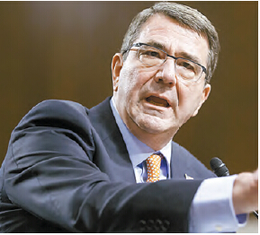 美国国防部长卡特(下图)美东时间5月27日向中国发出罕见强硬表态,要求中国停止在南海的岛礁建设活动,并宣称美军舰机将继续对该海域实施巡逻。中国外交部发言人华春莹昨日回应,在南海问题上任何人都无权要求中方怎麽做,中国人自有判断。