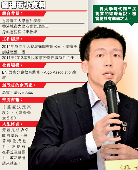 俗话说,机会属于有準备之人,自大学时代起三度创业的全人发展顾问训练总监梁璟珩认为,创业者应将这句话铭记于心,并在自我介绍、心态及观念三个方面及早做好準备,以抓住更多发展机遇。香港商报记者黄希尔