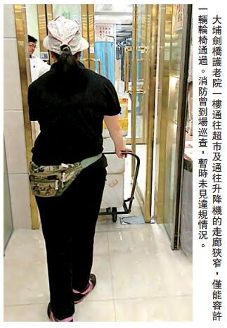 此外,就有報道指該院舍疑未獲批準,就偷步改裝一樓部分樓層為超市,占1樓的3分1的樓面。消防處下午派員到大埔劍橋護老院巡查,了解有否如報道所指擅自改建,處方傍晚回應說,巡查期間沒有發現阻塞走火通道的情況。現場所見,一樓通往超市及通往升降機的走廊狹窄,僅能容許一輛輪椅通過。
