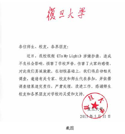 復旦大學微博今發布致歉聲明:“近日,我校視頻《to my light》涉嫌抄襲,造成不良社會影響,損害了學校聲譽,傷害了大家的感情,對此我們表示真誠致歉。