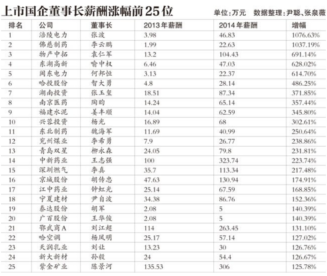 新京報記者統計發現,有29位上市國企董事長的年薪漲幅超過了100%,除去8位前一年年薪“基數”低于10萬元的,仍有21位董事長在年薪10萬元以上的基礎上,獲得了超過100%幅度的漲薪。