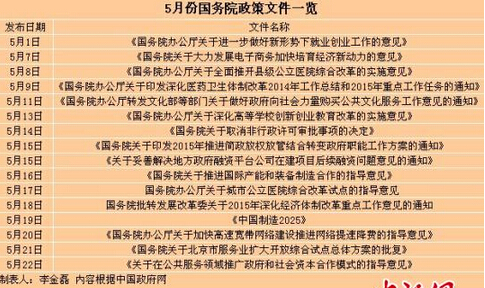 中新网北京6月1日电(记者 李金磊)刚刚过去的5月份,国务院先后出台了十余份重磅文件。从推进简政放权、部署医改,到发布《中国制造2025》,再到促进大众创业、万众创新,督促网络“提速降费”……一系列动作凸显出“促改革、调结构、惠民生”这三大关键词。