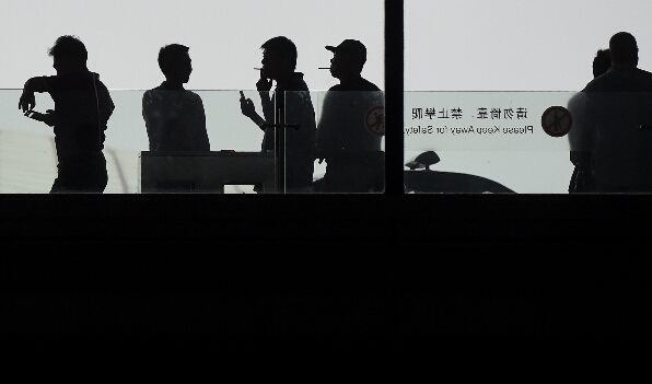 6月1日,旅客在北京首都机场T3航站楼外专设的吸烟区吸烟。