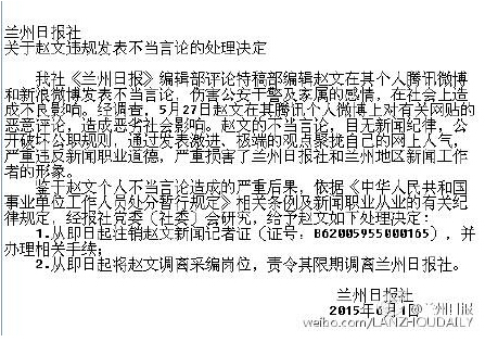 兰州日报社关于赵文违规发表不当言论的处理决定。