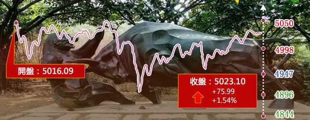 截至收盤,滬指漲1.54%報5023.10點;深成指漲0.85%報17649.09點。兩市成交均破萬億。