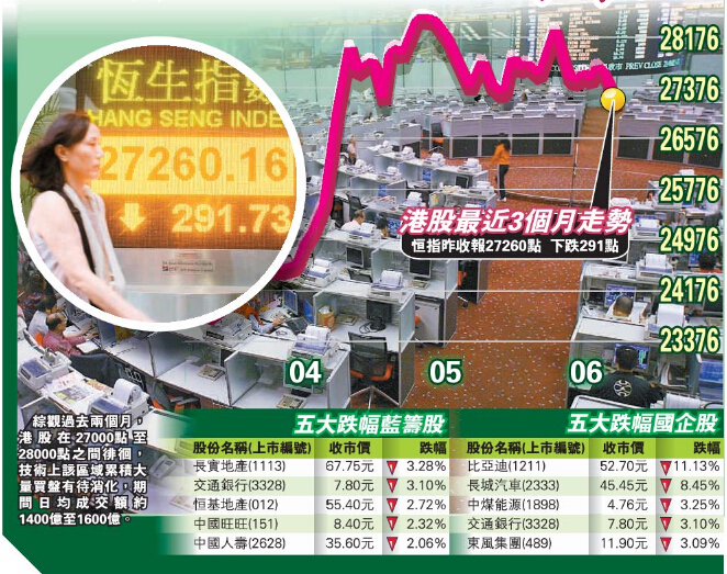 【香港商報訊】記者伍敏報道:6月份港股延續5月跑輸A股的格局,昨天恒指走勢再度與滬深兩市持續V形反彈的大好形勢脫恥,收跌291點,成交縮至1584億元,港股本周累跌164點,國指則累挫189點,AH溢價指數重見3月份的135高位。日前造好內銀板塊高位回吐,交銀(3328)及建銀(939)分別跌3%及1.5%,騰訊(700)亦是拖累大市的元凶,收跌3%。