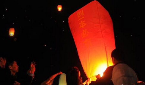 6月4日,赶考前夜,毛坦厂中学的学生们在孔明灯上写下心愿,向天空放飞希望,万只孔明灯映红了小镇上空。当日,安徽省六安市毛坦厂镇毛坦厂中学即将迎来2015年度高考。赶考前夜,高三学生与陪读家长在学校周边的空地上放飞孔明灯,预祝高考金榜题名。 中新社