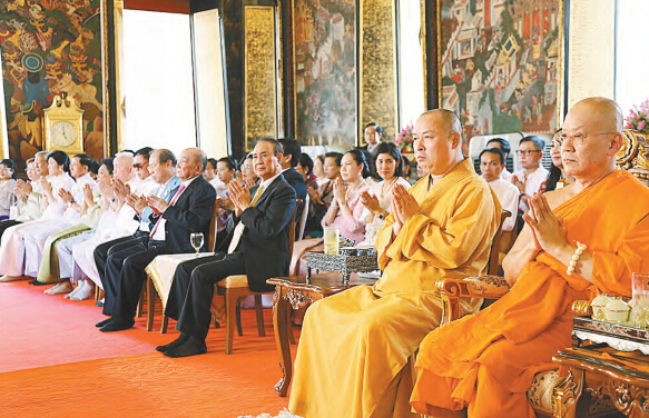 【香港商報網訊】5月30日,泰國金山寺建寺232年暨帕·蓬瑪西提長老升座慶典在曼谷金山寺隆重舉行。這是金山寺繼前任住持與僧王長老圓寂之后,舉行的第一次重大活動。中國佛教協會向金山寺發去賀電,深圳弘法寺方丈印順大和尚受邀前往,代表中國佛教界向金山寺及帕·蓬瑪西提長老表示熱烈祝賀。6月1日,印順大和尚參加法會之后,受泰國僧王的委託,王室邀請,前往泰國參加曼谷皇家寺廟鄭王廟舉行的2015年衛塞節,并與泰王妃帕空照·頌沙瓦尼共同主持祈福法會的活動。