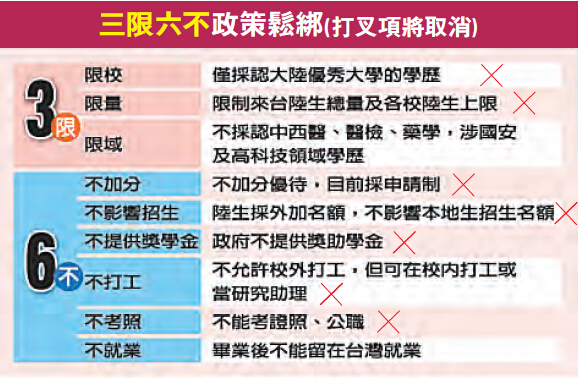 对此,教育部次长陈德华响应,现行陆生赴台及大陆学历采认的「三限六不」,仅会保留陆生毕业不能留台就业及不采认大陆医事学历两项,其他将陆续解禁,会让他们可领政府经费的奖学金及担任助教,至於纳健保要立法院支持,须花一点时间才能达成。