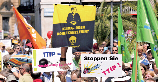 美國的區域貿易協議遇到的阻力越來越大。圖為在G7會場外,示威者高舉標語,反對美歐的TTIP協定。