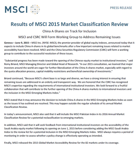 盡管MSCI明晟公司稱中國A股仍將進入其2016年的年度評估,但同時強調一旦其指出的問題解決,就可能隨時宣布將中國A股納入MSCI新興市場指數,而宣布的時間可能不在常規的年度評估時間范圍內。