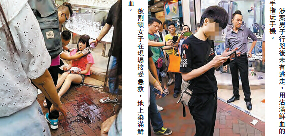【香港商報网訊】記者馮仁樂報道:旺角鬧市街頭昨晚驚現鎅頸放血傷人案,一名90后青年疑近日與女友情海翻波,有人竟持半尺長利刀向正在與朋友逛街的女友施襲,女友及時閃避,結果誤中副車割傷一名同行女友人左頸,女傷者當場血流如注坐倒地上,路上途人及休班救護員見狀立即替她止血,涉嫌傷人的青年十分冷靜,未有離開現場,更以沾血雙手站在現場把弄手機,警員接報迅即到場,將疑犯拘捕,女傷者送院搶救后幸無性命危險。