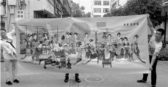 這幅《琴棋書畫圖》長3.2米,寬1.5米,需要三個人才能將其完全平展開來。(右一男子便是王靜)