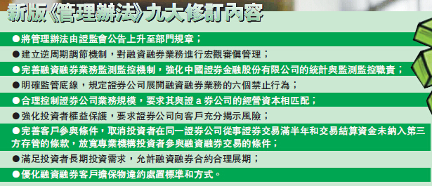 業務金額不超凈資本四倍在放寬部分條件的同時,新版辦法亦提升了監管級別。證監會今后將建立健全融資融券業務的逆周期調節機制,對兩融業務實施宏觀審慎管理。證券交易所建立融資融券業務風險控制指標浮動管理機制,對兩融業務保證金比例、標的證券範圍、可充抵保證金證券範圍和折算率等進行動態調整,并對可充抵保證金的各類證券制定不同的折算率要求。