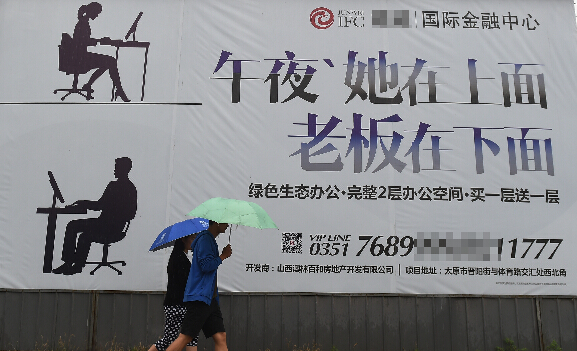 据中新社报道,太原街头一处房地产广告近日引起网友的广泛争议。 6月15日,山西太原,街头一则广告语为“午夜她在上面老板在下面”的房地产广告引起民众反感。不少市民表示,该广告语有不健康的引导倾向,属于恶俗趣味。