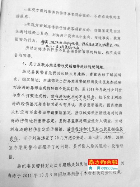 肖的上告,獲鹿邑縣紀委監察局介入調查。監察局干部張祥林隨后前往鹿邑縣真源醫院調出CT片子,查明劉海濤的鼻骨傷,實際是2011年與另外一人打架造成,鹿邑警方法醫趙杰作出的傷情鑒定,系用舊傷作假,炮制出輕傷鑒定,錯誤明顯。