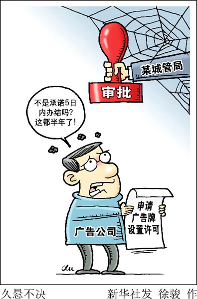溫州市民薛鵬飛向記者反映,他去年底向當地城管申請一塊戶外廣告牌的設置許可,辦事窗口承諾5日內給辦結,但半年過去未辦下來。這塊小小的戶外廣告牌在多個部門之間遭遇“踢皮球”,既折射出當前群眾在基層辦事之難,也反映出一些部門“有權任性”的作風還需要進一步轉變。
