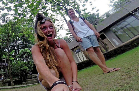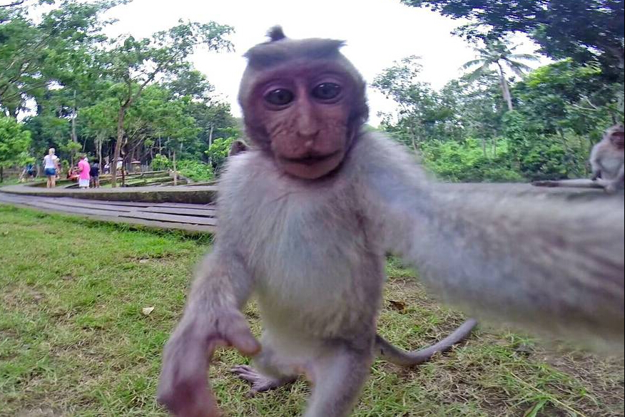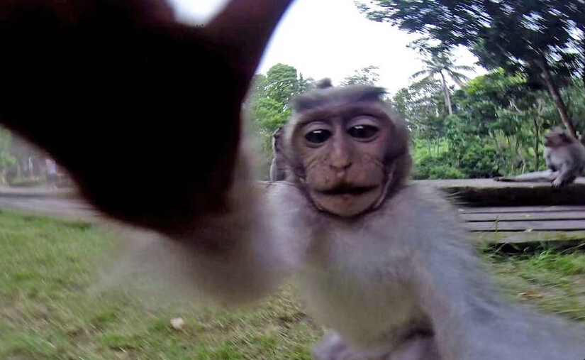 印尼巴厘岛乌布,23岁的利齐·韦尔在当地喂食一只长尾猕猴时,被这只灵长类动物抢走了自己相机。长尾猕猴在抢到相机后,竟然开始舔起了镜头,并按下了相机快门。阵疯狂之后,它还跳到了利齐的头上,不过淡定的利齐却和她的伴侣本•福尔摩斯一起抓住机会和这位毛茸茸的新朋友一起拍下了自拍。