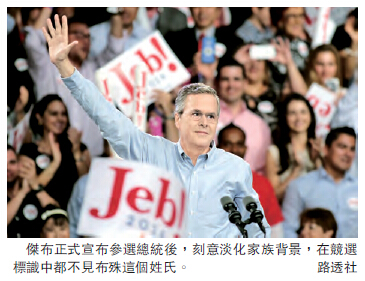 有一個事實也許有助於了解顯赫家庭背景對競選人的影響。在15日宣布角逐黨內初選的造勢會上,不僅老布殊及小布殊這兩位前總統都沒出現在造勢現場,而且傑布和他的團隊也刻意淡化家族背景,以至於連競選標識中都沒用布殊這個姓氏,而是打出了「傑布--2016!」這個招牌。而傑布(Jeb)本是他的昵稱,取自他原名的三個首字母。