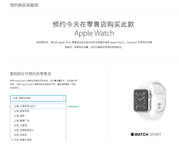 點擊鏈接后,用戶可以根據自己所在的城市選擇查找附近可預約的零售店,在我們選擇了北京西單大悅城店之后,官網提示“在這家零售店中,你選擇的機型目前備有庫存。今天的下一段可預約時間為 上午 10:00。” 從提示內容我們也可以看出,在零售店開放購買初期,用戶是否能夠完成預約購買要取決于所選擇零售店的庫存情況。