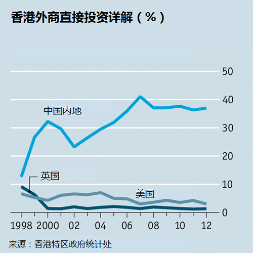 然而,隨著時間的推移,香港經濟已被逐漸吸引到中國的軌道上來,其最明顯的標志便是大量的現金和游客從內地涌入香港。內地投資占香港外商直接投資總額的份額從上世紀90年代末不足1/10,上升到今天將近2/5(見圖表1)。如果計入在英屬維爾京群島和開曼群島注冊的內地企業,這個比重甚至會更高。地產咨詢公司世邦魏理仕指出,在香港主要商業區的高端寫字樓,內地企業入駐率從2008年的12%上升至去年的19%。