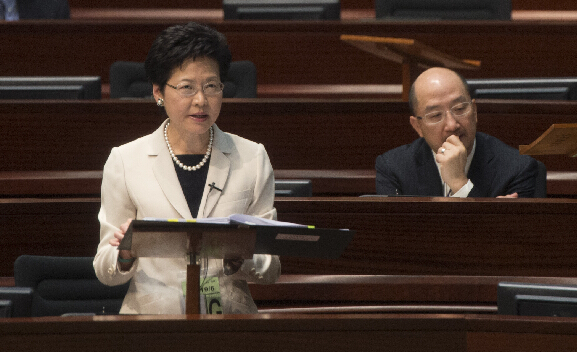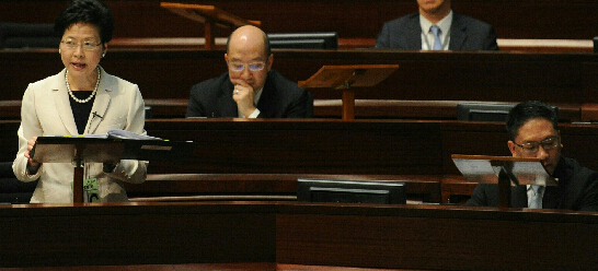 昨日立法会审议政改议案,林郑月娥(左一)在立法会会议上发言。新华社