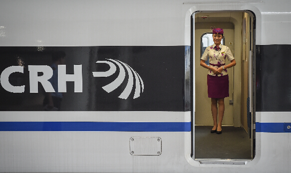 6月18日,在贵阳北站站台,G3002次列车工作人员在等待乘客上车。