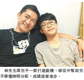 林先生的兒子就讀小四時,成績突然大倒退,跌至全級榜尾位置。他和太太頓時緊張起來,出力催谷兒子,更經常向兒子強調學業的重要,但始終成績未見進步,親子關系卻開始惡化。兒子不肯與父母外出,亦不願跟他們溝通。后來,林先生轉換管教方針,減少與兒子談論功課,增加親子活動,甚至向兒子請教玩電子游戲的竅門。透過玩耍、游樂,父子關系更加親密,彼此的距離拉近了。數年間,兒子從游戲中學懂時間分配,成績逐漸進步,最后憑個人實力考入心儀中學。