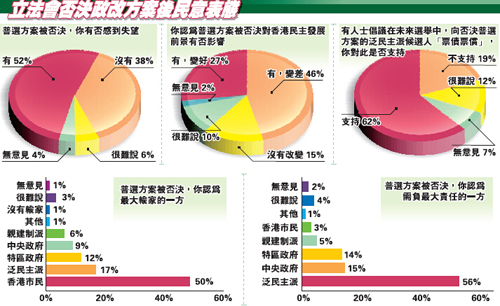 被问到谁需负最大责任?最多受访者表示是「泛民主派」(56%),其次是「中央政府」(15%),再次是「特区政府」(14%),反映大部分市民认为泛民主派需为方案遭否决的结局负上最大责任。