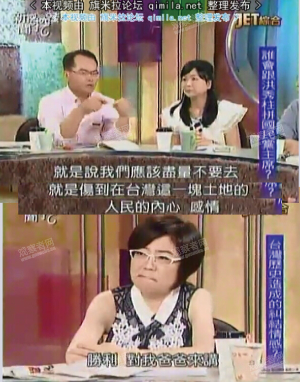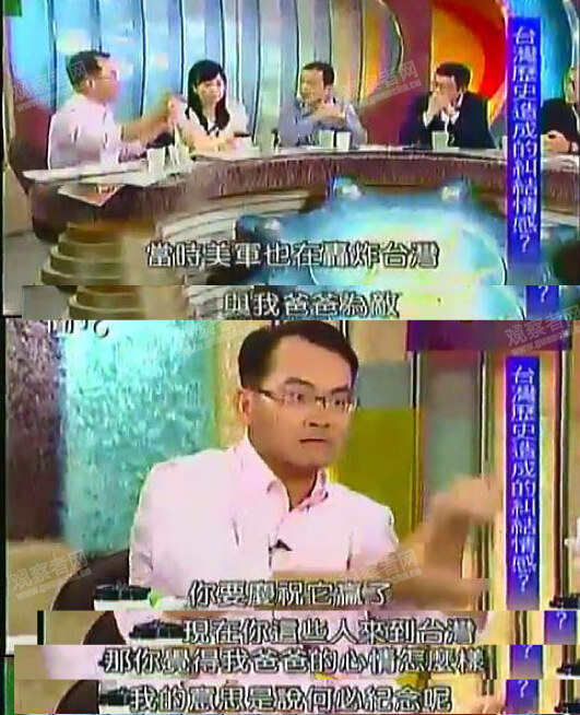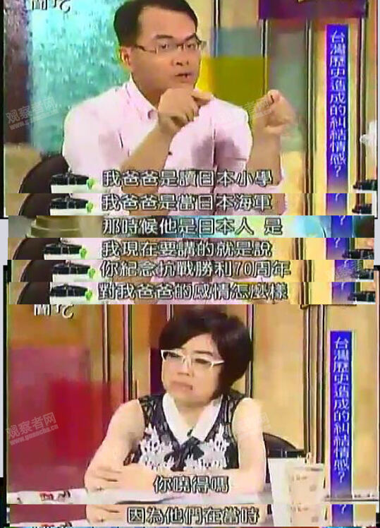鄭弘儀接著講,“因為我爸爸算比較晚期,他只有十多歲(的時候)就去當日本海軍,因為那時候的兵源越來越少……我現在要講的就是說,你現在紀念抗戰勝利70周年,想過我爸爸的感受嗎?當時的中國軍隊打的是包括臺灣在內的日本,美國軍機轟炸臺灣,這都是與我爸爸為敵。現在你這些人來到臺灣,你要慶祝它贏了,那你覺得我爸爸的心情怎么樣?我無意去挑動這一邊的人不應該高興,我的意思是說,何必紀念呢?!”