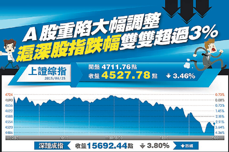 【香港商報网訊】記者朱輝豪報道:昨日A股再度受挫,兩市板塊普遍下跌。截至收盤,滬指報4527.78點,跌幅3.46%;深成指報15692.44點,跌幅3.8%;創業板報3206.38點,跌幅5.23%。專家認為,前期收杠桿等市場調整行為仍在起著很大的作用,A股目前進入了估值修復的緩慢階段,有新股發行量大、企業高管減持節奏不變等六大因素,都使股市經歷一個從過高估值回到合理估值的過程。不過市場普遍認為,牛市基本格局未變,但腳步逐漸放緩,后市會延續小幅震盪局面。