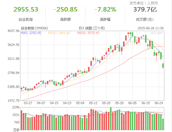網易財經6月26日訊 創業板指昨日走低,險守3200點,今早延續下跌走勢,大幅低開,報3078.40點,之後震蕩走低,失守3000點重要關口,最低見2934.67點,跌幅達8.47%,創曆史最大跌幅,截至午間收盤,創業板指下跌7.82%,報2955.53點,半日成交903.5億元。
