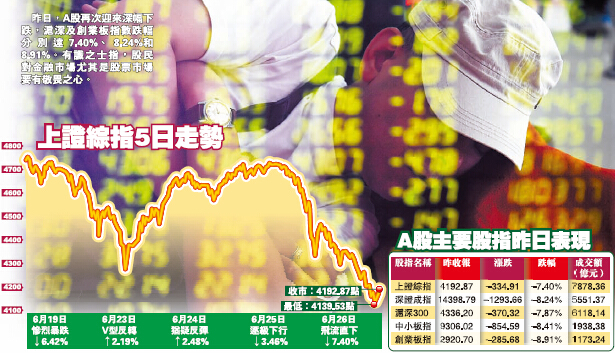 【香港商報網訊】昨日A股,又是一個可以載入歷史的黑色星期五。上證綜指暴跌7.4%,收4192.87點,創年內第二大單日跌幅。深成指慘跌8.24%,收14398.79點;創業板更大跌8.91%,收報2920.70點。滬深兩市逾兩千股票跌停,股指期貨亦全線跌停。最近9個交易日滬指跌近千點,市場信心受到嚴峻考驗,股民恐慌情緒揮之不去。降準預期落空、場外配資縮減、抽血效應不減是近期A股暴跌的主要原因,前所未見的槓桿牛市以前所未見的慘烈暴跌,教訓了無數股民。不過,接受本報採訪的專家指,長期來看,A股慢牛格局未變,當前持續重挫是對前期巨大漲幅的風險釋放,藉此引導A股回歸合理估值。香港商報記者 朱輝豪