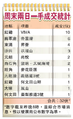 【香港商報网訊】記者劉家麗報道:人民銀行上周六罕有地雙管齊下「放水」,本港過去周末兩日(6月27至28日),一、二手住宅交投齊升。綜合一手物業銷售網及市場消息,截至昨晚8時,周末兩日錄約32宗一手成交,按周升28%。長實地產(1113)旗下紅磡VIVA交投最好,有6宗成交。