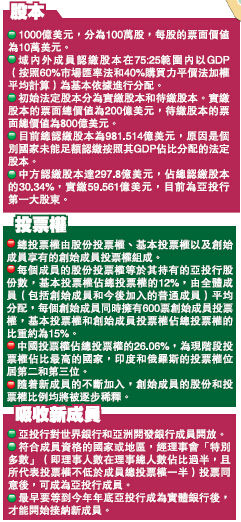 針對中國擁有事實上的重大事項「一票否決權」,中國財政部副部長史耀斌指出,這一結果並非中方刻意謀求,而是根據各方確定的規則自然得出的。今後隨著新成員的加入,中國和其他創始成員的股份和投票權比例均可能被逐步稀釋。