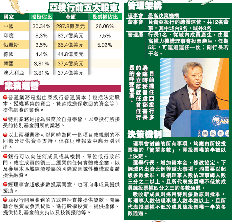 根據公布的亞投行協定內容,在「成員資格」一項中規定:「亞投行成員資格向國際復興開發銀行和亞洲開發銀行成員開放。不享有主權或無法對自身國際關係行為負責的申請方,應由對其國際關係行為負責的銀行成員同意或代其向銀行提出加入申請」。