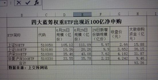 交所剛剛公布的規模信息顯示,6月29日滬市四大藍籌ETF一起出現大幅凈申購,合計資金流入規模高達100億元,ETF單日出現如此大的申購規模,實屬罕見。顯示已經有神秘資金抄底股市。