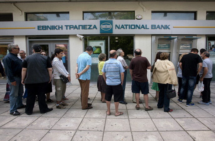 6月27日,人們在希臘首都雅典一家銀行的取款機前排隊取款。