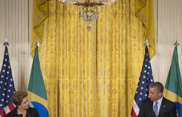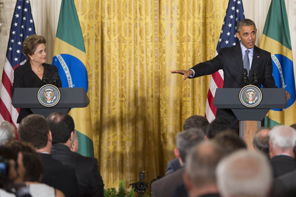 6月30日,在美國華盛頓,美國總統奧巴馬(右)與巴西總統羅塞夫出席在白宮舉行的聯合記者會。新華社/法新