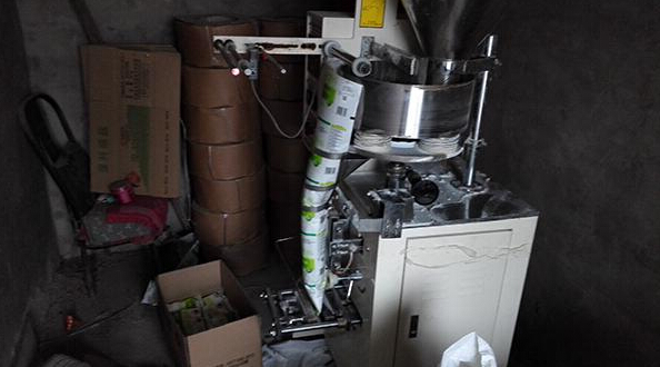 2014年下半年起,王某的加工流程更加簡化:他花了一萬多元買了分裝機,只要將工業鹽原料倒進漏斗中,就能自動分包。“兩三個小時就能裝完一噸的量。”