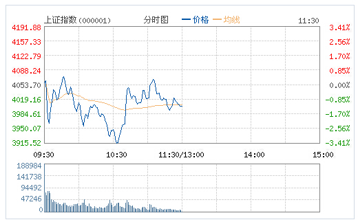 周四兩市小幅高開,開盤后股指直線下挫下探半年線,隨即震蕩反抽,多空激戰4000點。截至午間收盤,滬指跌1.24%報4003.54點;深成指跌1.30%報13473.94點。創業板指逆市漲0.47%。