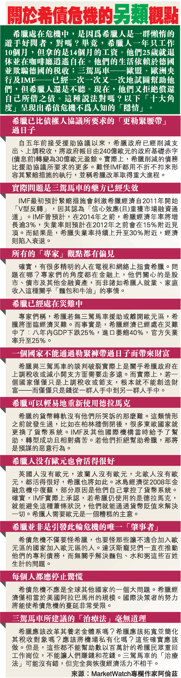 默克爾認同德國財長朔伊布勒「休克療法」的觀點。該觀點認為希臘離開歐元區后,歐元區經濟將重新回升。然而,法國政府對此并不認同,他們認為這一做法政治風險太高。有政府內部人士評論這是「一場豪賭」,「德國人生活在自己的世界里」。相反,默克爾認為「歐洲的前途不是兒戲」,她在「冷靜地」等待希臘公投結果。但無人知曉公投結果出來之后,希臘危機會如何發展。