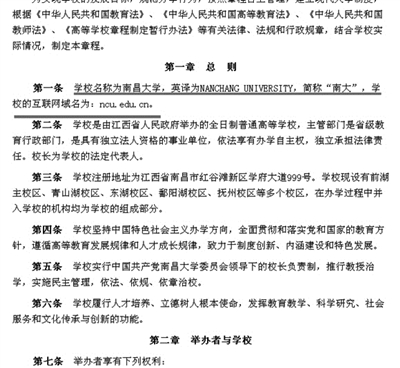 據了解,近日南昌大學在官方主頁南昌大學新聞網正式發布了《南昌大學章程》。記者看到,該章程系根據教育部《高等學校章程制定暫行辦法》和《江西省高等學校章程核准辦法(試行)》精神,經江西省高等學校章程核准委員會第2次會議評議,並報省人民政府同意,教育廳核准發布。