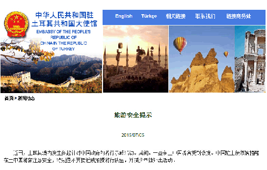 大使館網站刊發消息稱,近日,土耳其境內發生多起針對中國政府的游行示威活動。其間,一些在土中國游客受到襲擾。中國駐土使領館提醒在土中國游客注意安全,特別是不要接近或拍攝游行隊伍,并減少單獨外出活動。