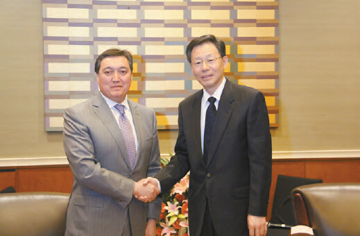 6月23日,江蘇省長李學勇(右)在北京與哈薩克斯坦國有鐵路股份公司總裁馬明舉行會商。雙方將在中哈(連雲港)物流合作基地、上合組織(連雲港)國際物流園區建設等方面繼續深化合作,合力推動連雲港中哈物流合作園區上升為上合成員國物流基地。
