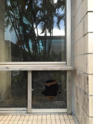 臺北市消防局6日3時55分獲報,臺北市政府B1樓(南區),疑似一樓建管有煙冒出。立即派員將火勢撲滅。現場有玻璃被砸,懷疑是人為縱火,起火原因還在調查。圖片來源:“中央社”
